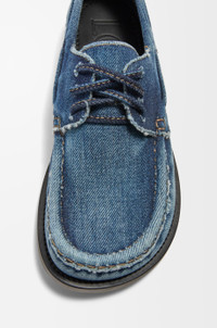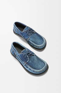 Boat shoe in washed denim featuring the LOEWE signature round toe shape and a hand-sewn construction with a supple leather lining and flexible sole. - 20mm heel - Squared leather lace closure - Padded leather insole - Rubber-injected leather outsole - LOEWE embossed tag placed at the side Details - Colour : Raw Denim - Main material : Washed Denim - Heel height : 1.5 - Weight : 0.75 kg - Model ID : LLSCS08X05 - Made in : Italy