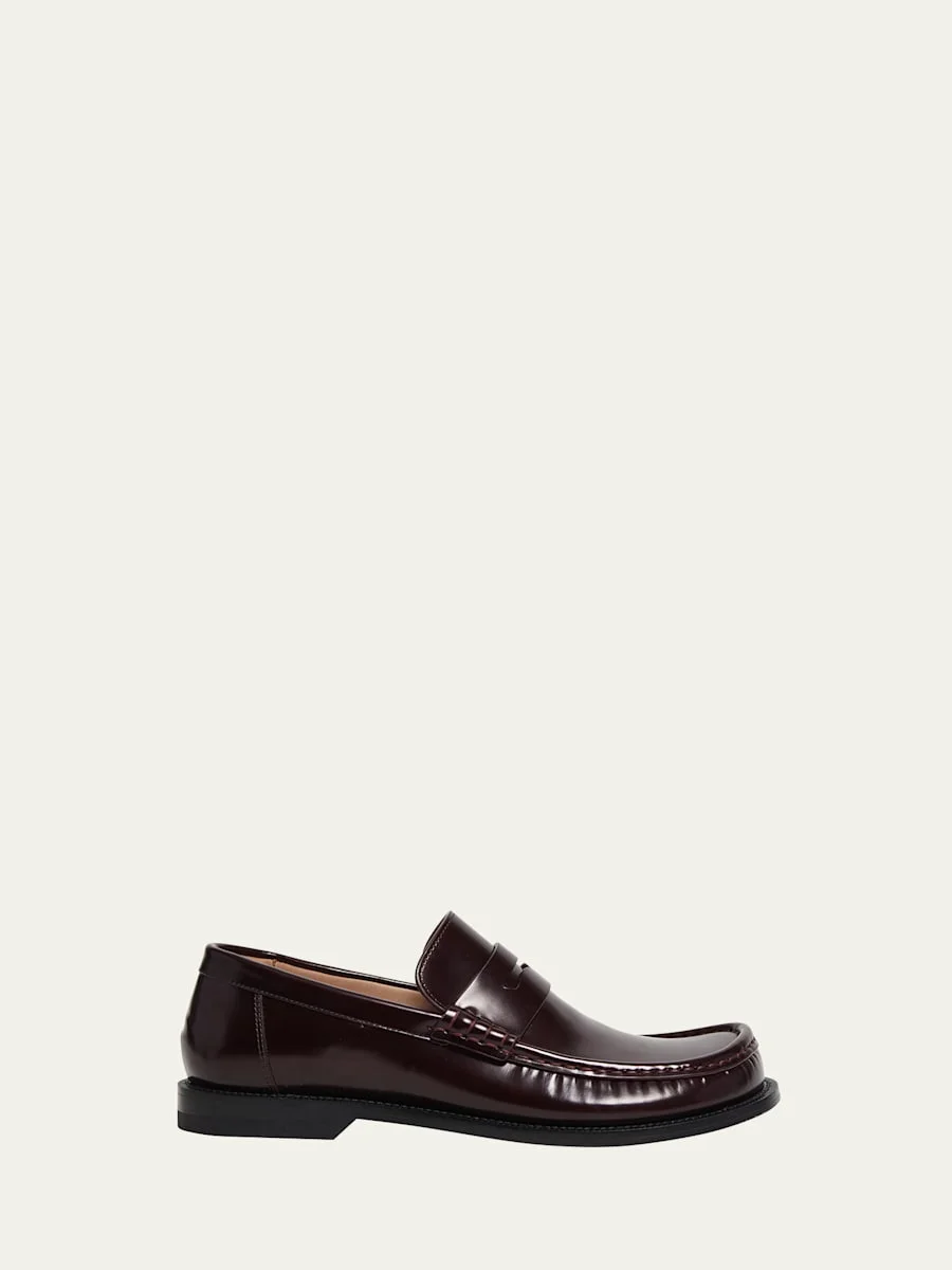 Loewe "Campo" sleek leather penny loafers 1.25 in / 30 mm block heel Round moc toe Notched vamp with keeper strap Slip-on style Leather outsole Made in Italy Online Inquiries: BGS21_X6N9Q| Store Inquiries: #4842052