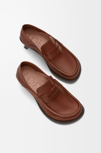 Loafer in soft calfskin featuring the LOEWE signature round toe shape, defined by a bulky asymmetrical look, and a collapsible heel. - 40mm kitten heel - Leather sole and extra padded leather insole Details - Colour : Rust - Main material : Soft Calf - Heel height : 4 - Weight : 0.7 kg - Model ID : LLSCS07X06 - Made in : Italy