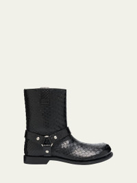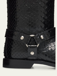 Loewe "Campo" genuine python biker booties with harness accent 0.50 in / 15 mm flat heel Round toe Pull tabs at collar Pull-on style Leather outsole Made in Italy This item cannot be sold or shipped to California. Online Inquiries: BGS21_X6PWX| Store Inquiries: #4874846