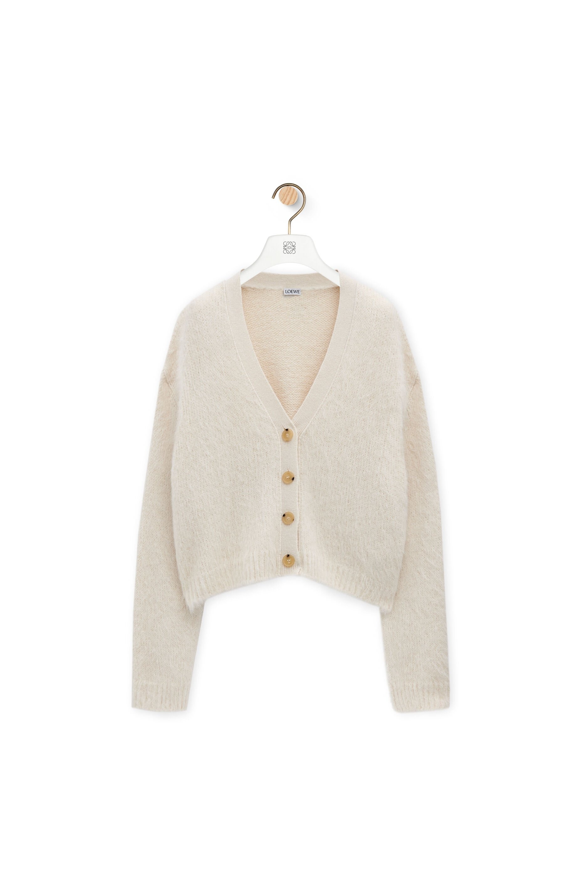 Cardigan in medium-weight alpaca and wool blend. - Relaxed fit, regular length - Jersey stitch - V-neck - Ribbed collar, cuffs and hem - Button front fastening - Tonal Anagram lacquered embellishment placed at the back Details - Colour : White - Main material : Surialpaca/Wool/Polyamide - Weight : 0.45 kg - Model ID : S359Y16K84 - Made in : Italy