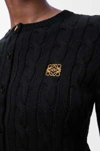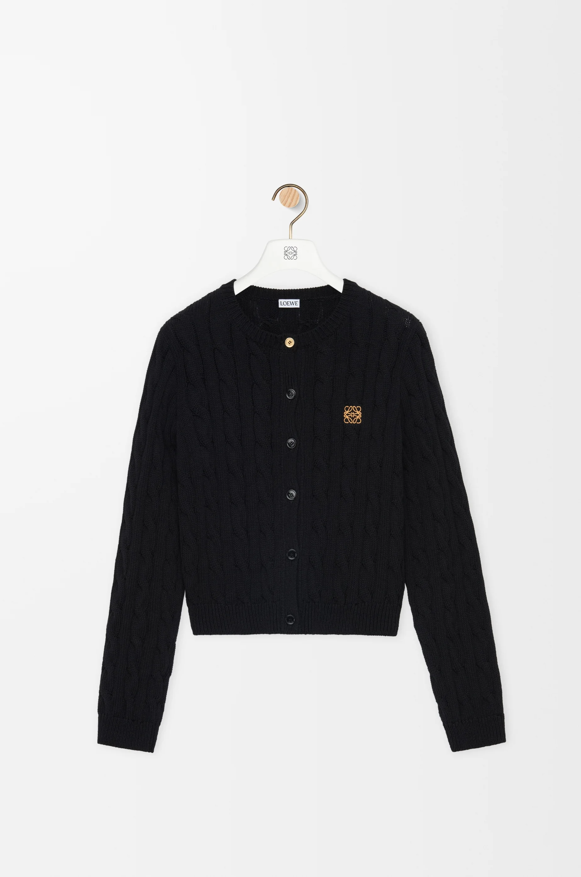 Cardigan in lightweight cotton. - Slim fit, short length - Cable stitch - Round neck - Ribbed collar, cuffs and hem - Button front fastening with metal button at the top - Contrast Anagram embroidery placed on the chest Colour: Black Main material: Cotton Weight: 0.36 kg Made in: Italy Materials & care Main Material: 100% cotton