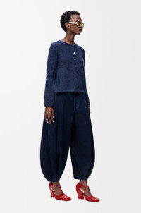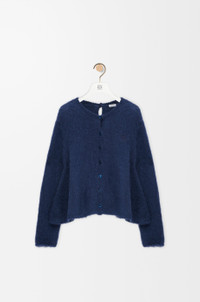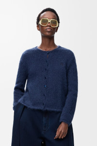 Cardigan in medium-weight mohair blend featuring a trapeze silhouette and button fastening at the front and back. - Regular fit, short length - Round neck - Anagram embroidery placed on the chest Colour: Navy Blue Main material: Wool/Mohair/Polyamide Weight: 0.4 kg Made in: Italy Materials & care Main Material: 65% mohair 29% polyamide 5% wool 1% elastane