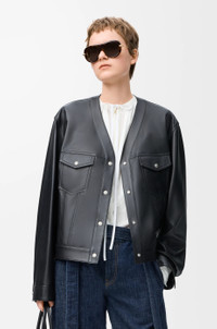 Cardigan in lightweight nappa lambskin. - Regular fit, regular length - V-neck - Snap button front fastening and cuffs - Buttoned chest flap pockets, vertical jet pockets - LOEWE embossed leather patch placed at the back Colour: Black Main material: Nappa Weight: 0.65 kg Made in: Spain Materials & care Main Material: 100% lambskin