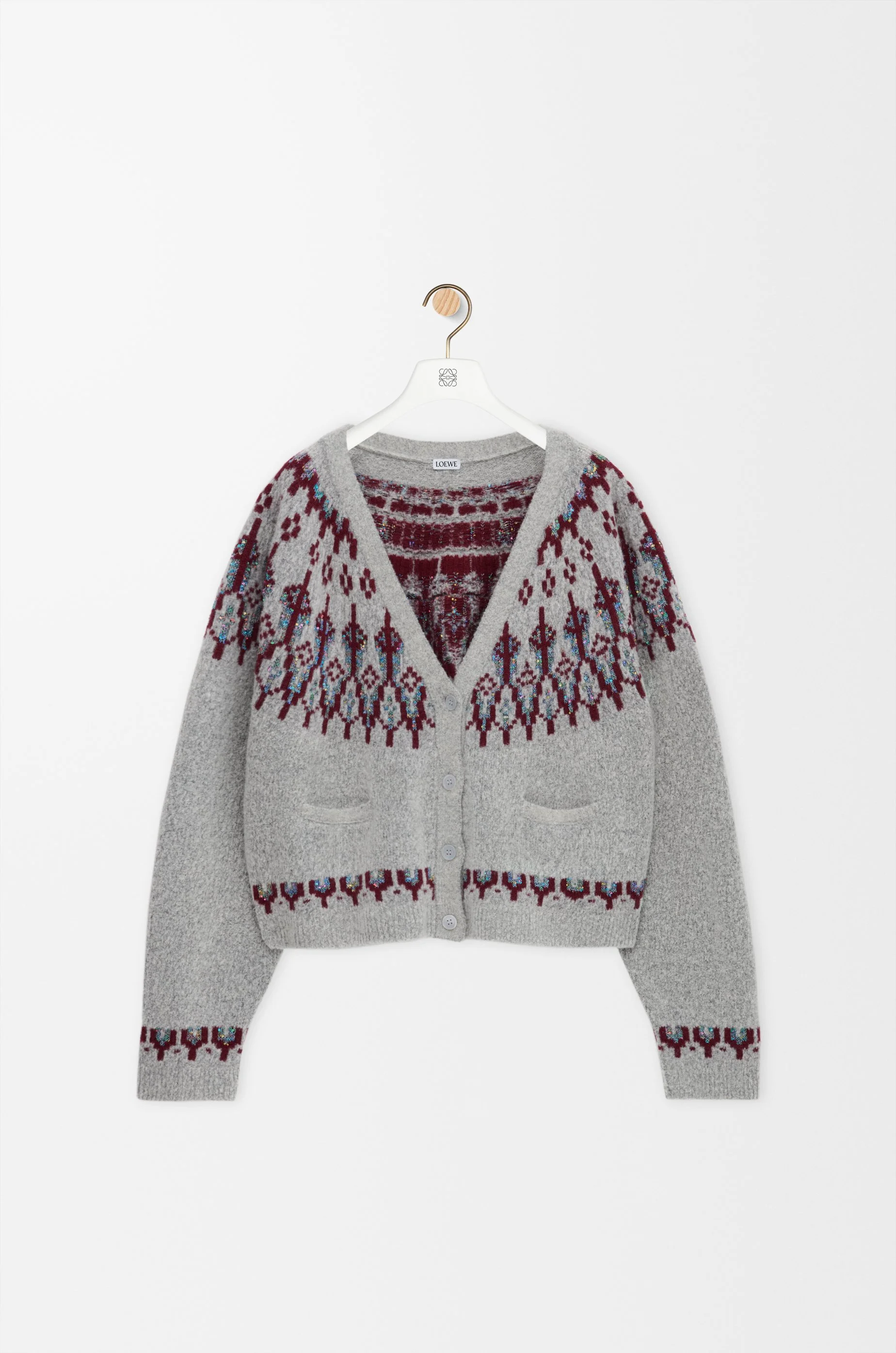 Cardigan in medium-weight wool blend featuring a boxy silhouette and a Fair Isle pattern with a sequinned yarn. - Relaxed fit, regular length - V-neck - Button front fastening - Welt pockets - Ribbed cuffs and hem - LOEWE jacquard placed at the back Colour: Light Grey/Multicolor Main material: Wool/polyamide Weight: 0.3 kg Made in: Italy Materials & care Main Material: 62% wool 37% polyamide 1% polyester