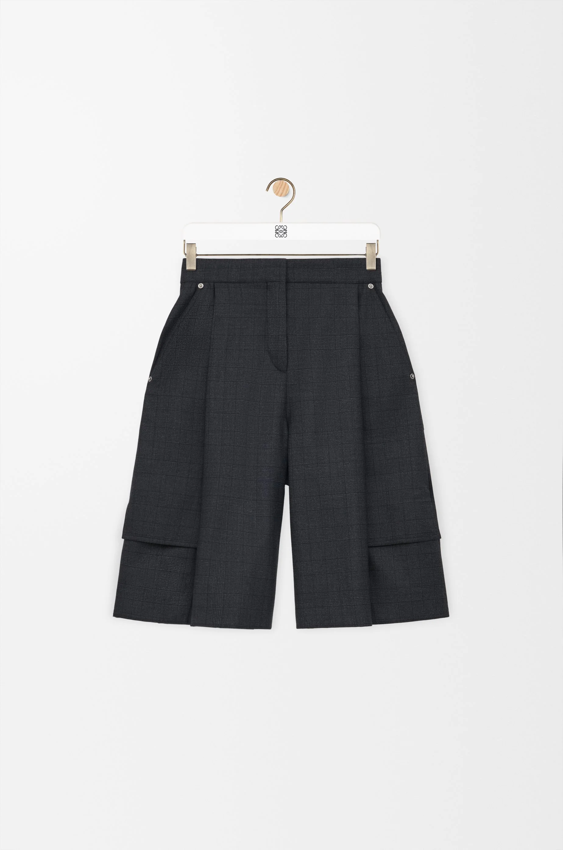 Shorts in lightweight checked fluid wool tailoring. - Relaxed fit, knee length - Mid waist - Concealed zip fly - Topstitched slash pockets, cargo pockets, maxi rear patch pockets - LOEWE embroidered patch placed at the back Colour: Dark Grey Main material: Wool Weight: 0.4 kg Made in: Italy Materials & care Main Material: 100% wool
