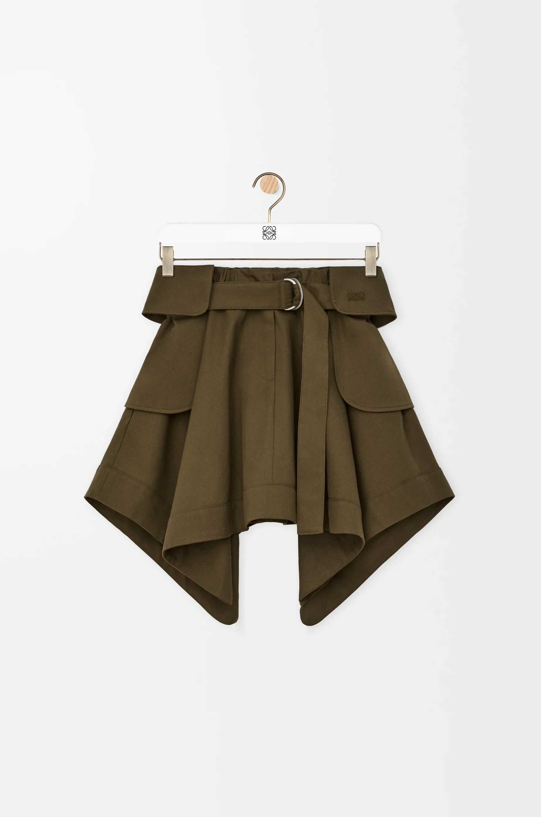 Skirt in medium-weight cotton and silk gabardine featuring cargo flaps at the hips. - Regular fit, short length - Mid waist - Concealed zip fly - Adjustable belt - LOEWE engraved D-ring, double L embroidery placed on the left pocket Colour: Khaki Green Main material: Cotton/silk Weight: 0.62 kg Made in: Italy