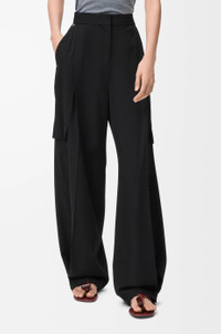 Trousers in lightweight fluid twill wool tailoring featuring an adjustable hem with button fastening. - Relaxed fit, regular length - Mid waist, loose leg - Concealed zip fly - Topstitched slash pockets, cargo pockets, maxi rear patch pockets - LOEWE embroidered patch placed at the back Colour: Black Main material: Wool Weight: 0.6 kg Made in: Italy Materials & care Main Material: 100% wool