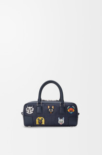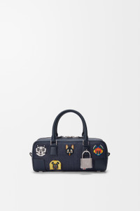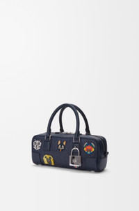 The Amazona displays a classic shape complemented by a signature padlock. This cropped version is crafted in denim embroidered with allover cat motifs. This bag is inspired by Louis Wain's "Futurist Cats" porcelain vase series. - Shoulder, crossbody or hand carry - Detachable and adjustable strap - Zip closure with calfskin pulls - One slip pocket - Protective metal feet on base - Gold suede lining - Embossed Anagram Colour: Blue Metallic colour: Palladium Main material: Embroidered denim Strap length: 85 - 112 cm Strap drop: 40 - 54 cm Handle drop: 10 cm Weight: 0.39 kg Height: 11 cm Width: 23 cm Depth: 10 cm Made in: Spain