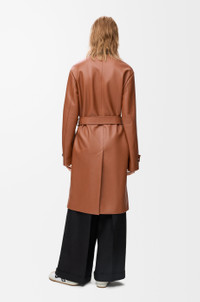 Coat in medium-weight mellow nappa lambskin featuring a contrast panel at the front and a removable belt with a roller buckle. - Regular fit, knee length - Classic collar - Concealed button front fastening, buttoned cuff tabs - Diagonal welt pockets - Back vent - Fully lined - LOEWE Anagram embossed leather patch placed at the back Colour: Tan Main material: Nappa Weight: 1.9 kg Made in: Spain Materials & care Main Material: 100% lambskin