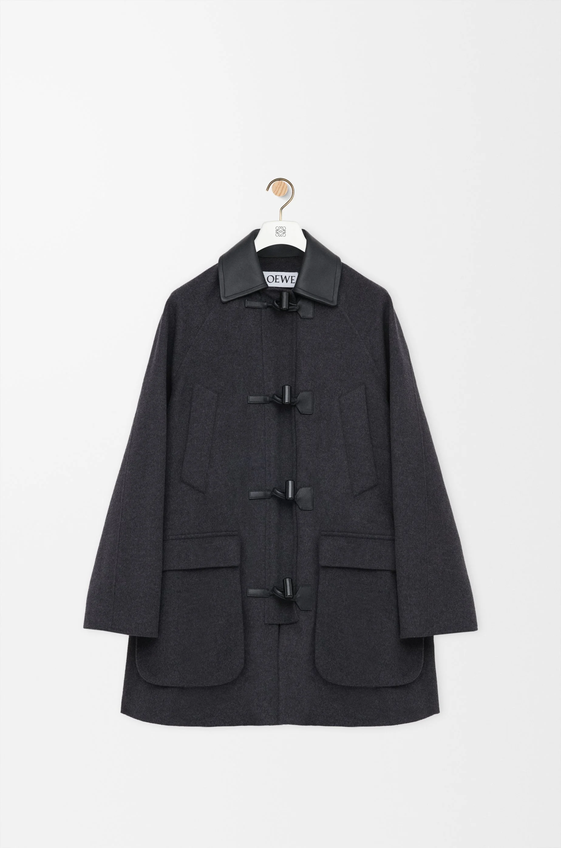 Coat in lightweight double face wool and cashmere featuring a trapeze silhouette with a leather collar and Anagram engraved toggle buttons. - Relaxed fit, short length - Raglan sleeves - Concealed zip front fastening - Vertical welt pockets, snap button gusset flap pockets - LOEWE Anagram embossed leather patch placed at the back Colour: Charcoal Melange Main material: Wool/cashmere Weight: 1.6 kg Made in: Italy Materials & care Main Material: 90% wool 10% cashmere