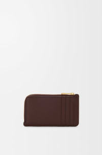 Coin cardholder in nappa calfskin and suede, layered and compressed to create a one-of-a-kind effect. - Four card slots - One zipped coin compartment with calfskin pull - Leather lining - Embossed Anagram Colour: Chocolate/Light Moss Metallic colour: Gold Main material: Nappa Calf Weight: 0.04 kg Height: 7.5 cm Width: 13 cm Depth: 1 cm Made in: Spain