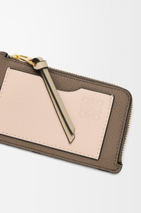 Coin cardholder in soft grained calfskin in contrasting colours with an additional card pocket on the front. - Four card slots - One zipped coin compartment with calfskin pull - Embossed Anagram Colour: Taupe/Talc Metallic colour: Gold Main material: Soft Grained Calf Weight: 0.05 kg Height: 7.5 cm Width: 13 cm Depth: 1 cm Made in: Spain