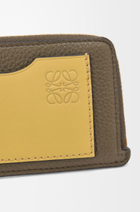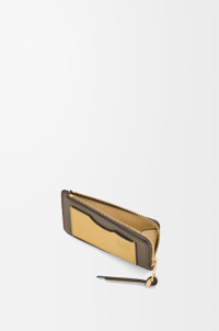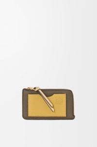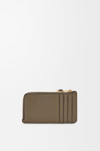 Coin cardholder in soft grained calfskin in contrasting colours with an additional card pocket on the front. - Four card slots - One zipped coin compartment with calfskin pull - Embossed Anagram Colour: Dark Khaki Green/Ginger Metallic colour: Gold Main material: Soft Grained Calf Weight: 0.05 kg Height: 7.5 cm Width: 13 cm Depth: 1 cm Made in: Spain