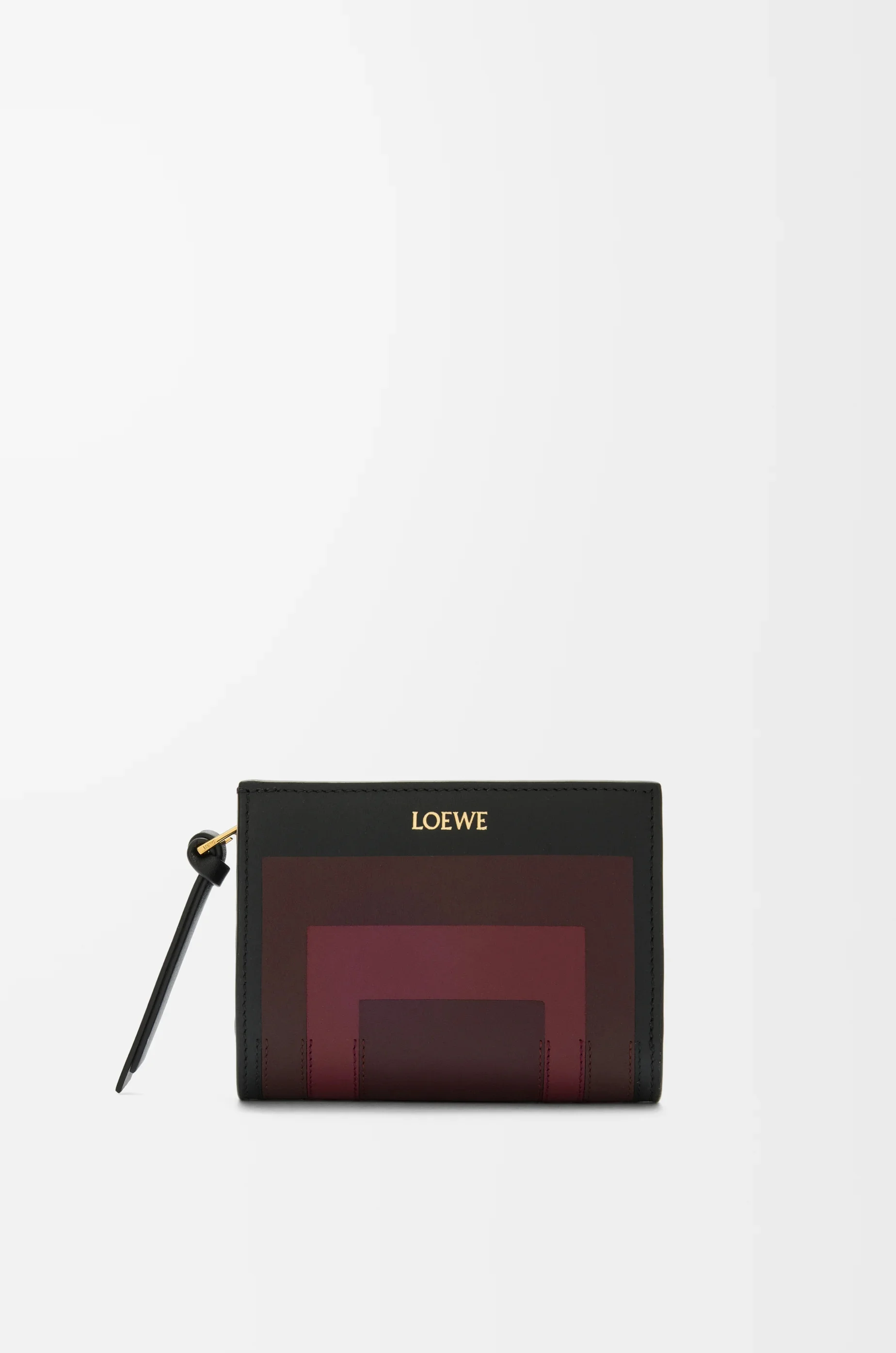 Compact wallet in nappa calfskin with leather marquetry squares inspired by Josef Albers's "Homage to the Square" series. This wallet is part of the LOEWE x Albers collection. - Six card slots, three internal slip pockets - One zipped coin compartment with knot calfskin pull - Snap button closure - Calfskin lining - Silver embossed LOEWE Colour: Black/Burgundy Metallic colour: Gold Main material: Nappa Calf Weight: 0.1005 kg Height: 8.5 cm Width: 11.4 cm Depth: 3 cm Made in: Spain