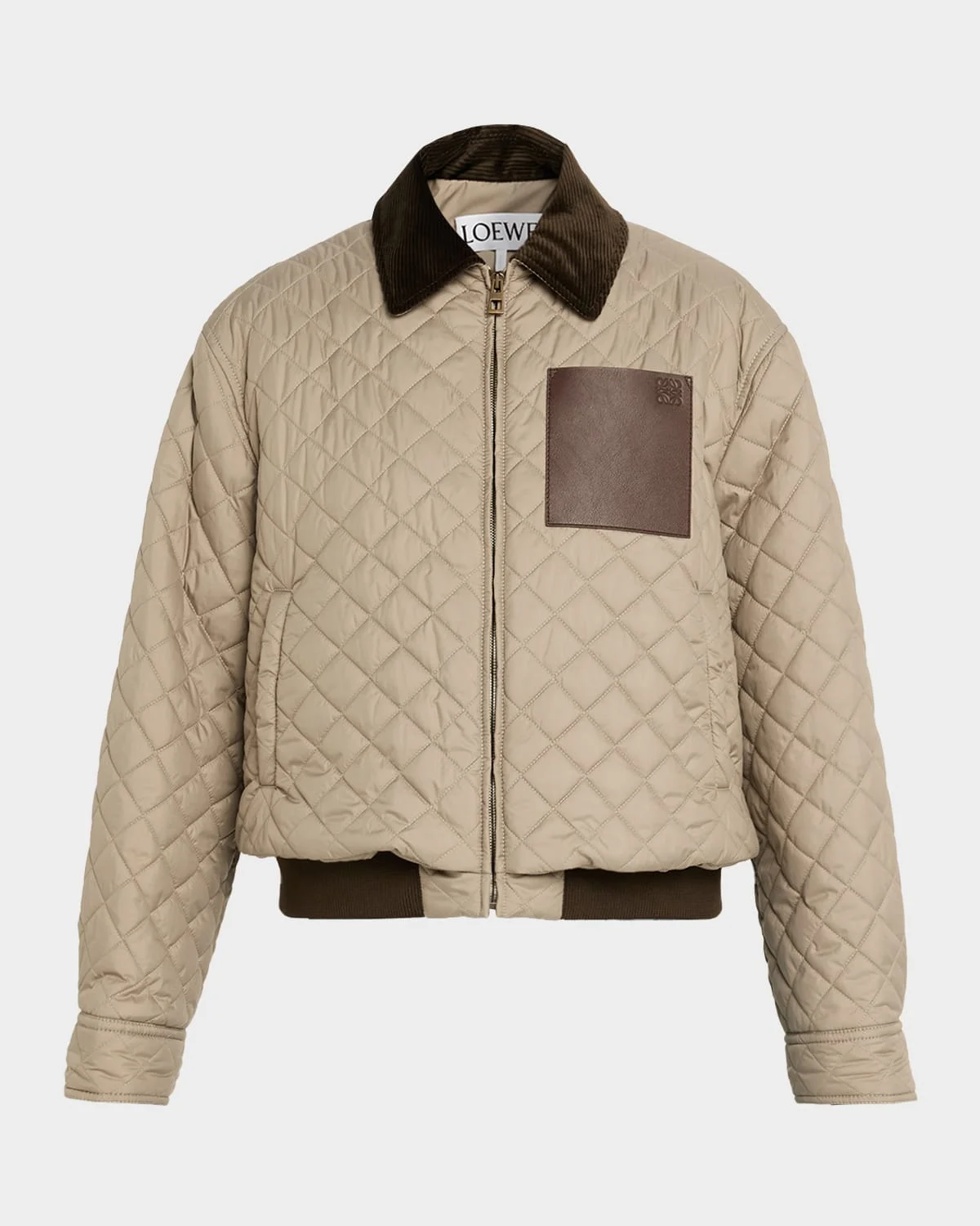 Loewe quilted barn jacket is crafted of a technical polyesterblend featuring a contrast corduroy collar, an anagram embossed leather chest pocket, and a double hem detail Point collar; zip front Long sleeves; snap button cuffs Hip welt pockets Regular fit HIp length Ribbed hem Polyester/cotton/leather Made in Italy