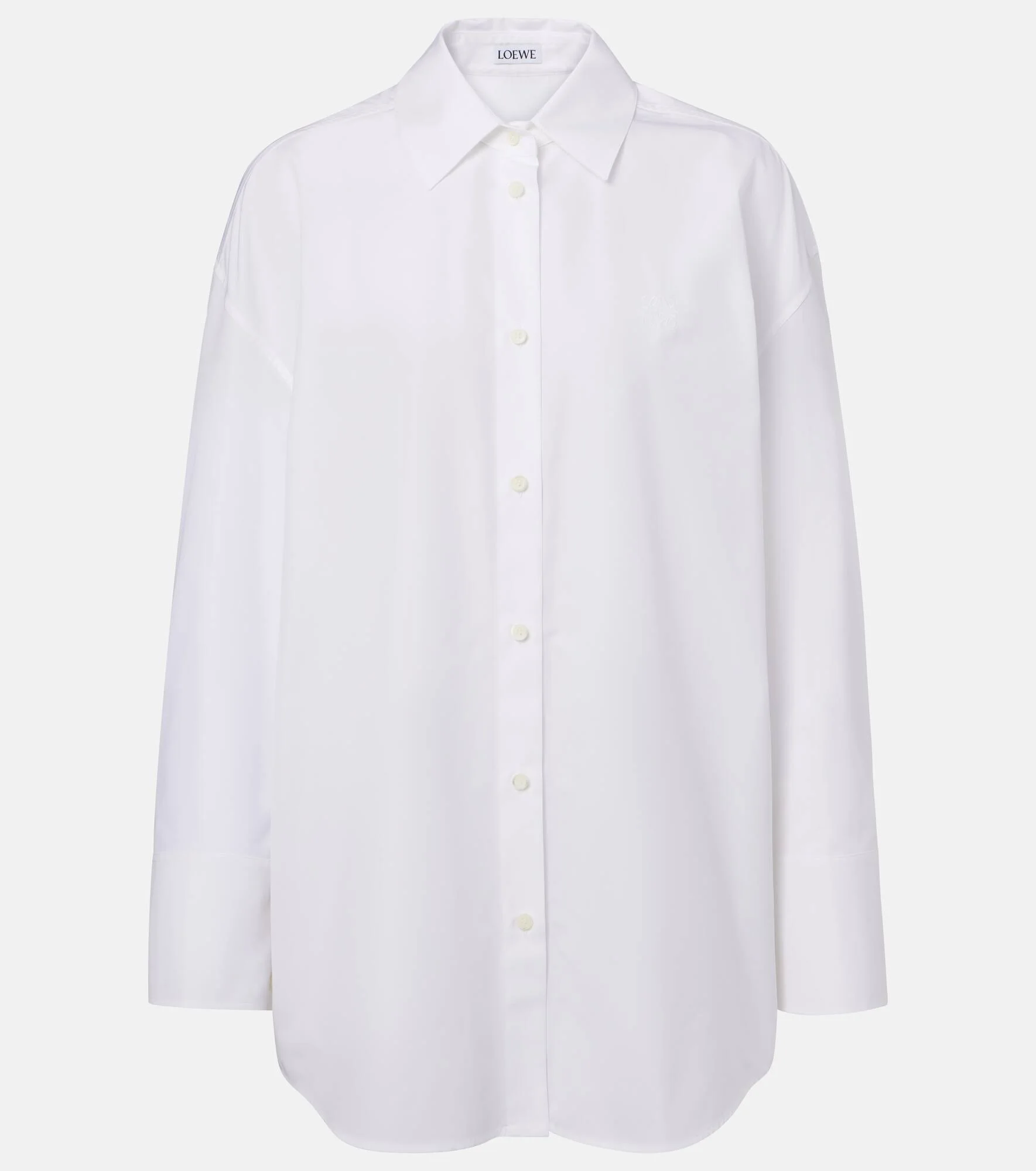 Crafted in Italy from pure cotton poplin, this shirt from Loewe showcases a curved hem. This design features dropped shoulders and is cut to a relaxed silhouette. Product Details - Material: 100% cotton - Care instructions: machine wash at 30 degrees - Made in Italy - Designer color name: White - Item color: white - Embroidery: 100% polyester - Contains non-textile parts of animal origin - Closure: buttoned placket - Collar: classic (Straight point) - Cuff: two buttons - Item number: P01066166 Size & Fit - True to size - Dropped shoulders - Oversized - Non-stretchy fabric - Falls below the hip - Height of model is 180cm-71" and wears a size FR 36