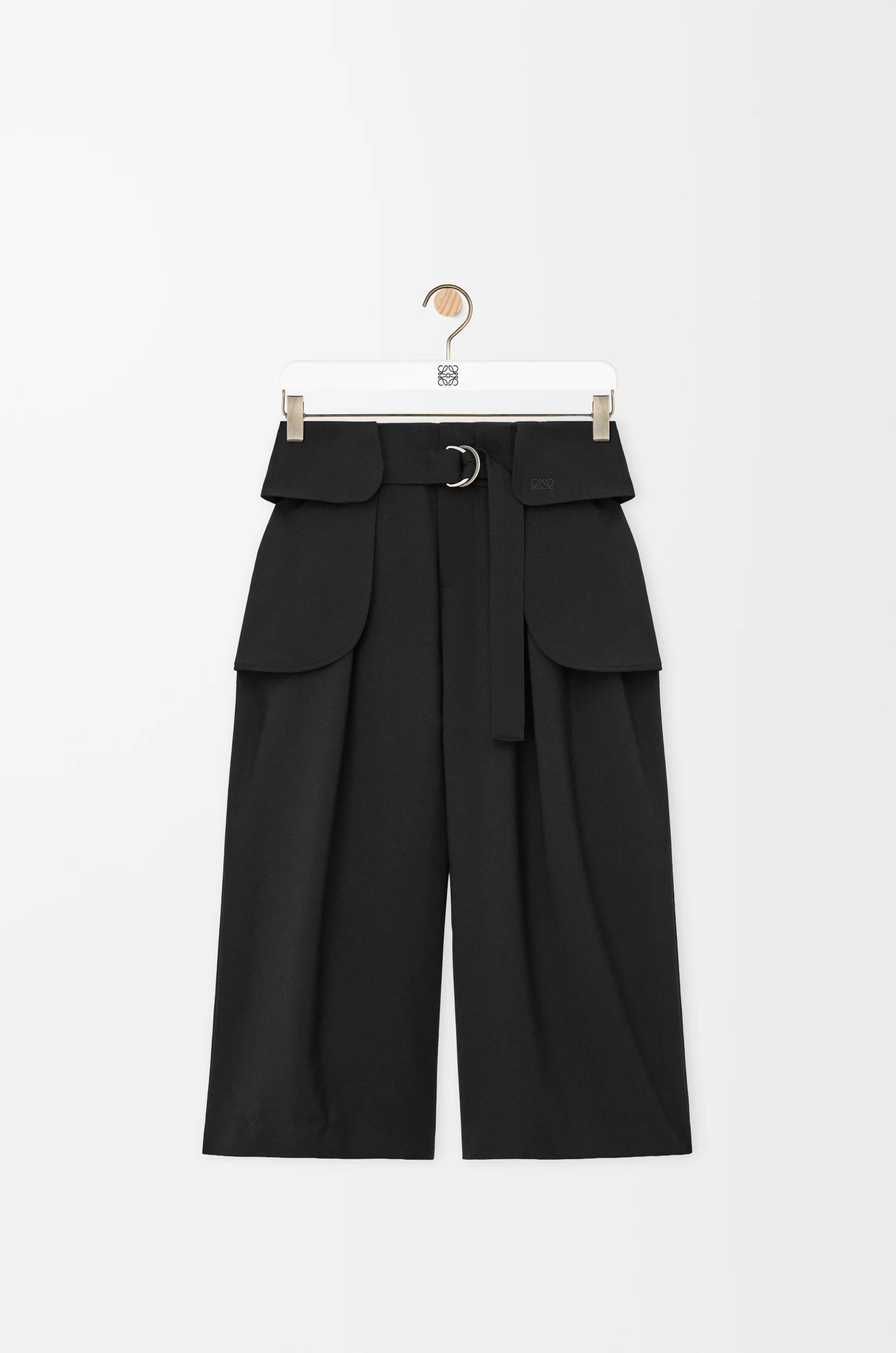 Trousers in lightweight wool tailoring featuring cargo flaps at the hips. - Relaxed fit, cropped length - Mid waist, balloon leg - Concealed zip fly - Hidden seam pockets - Adjustable belt - LOEWE engraved D-ring, double L embroidery placed on the left pocket Colour: Black Main material: Wool Weight: 0.49 kg Made in: Italy