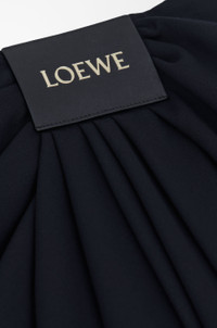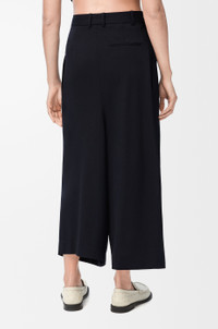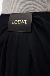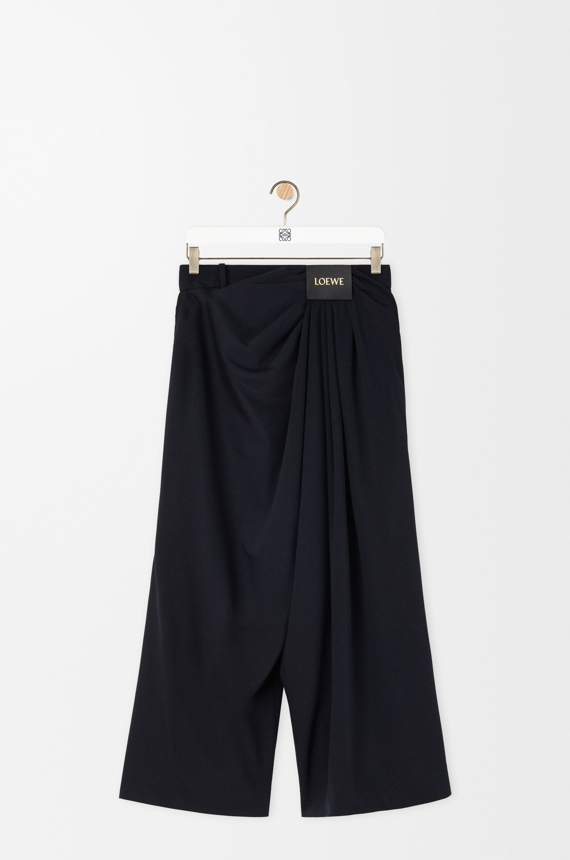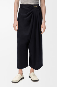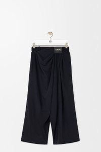 Trousers in lightweight fluid wool tailoring featuring asymmetric hand-gathered draping at the front. - Relaxed fit, cropped length - Mid waist, loose leg - Side hook and zip fastening - Side pockets, rear jet pocket - LOEWE embossed leather patch placed at the front Details - Colour : Dark Navy Blue - Main material : Wool - Weight : 0.6 kg - Model ID : S540Y04XL8 - Made in : Italy