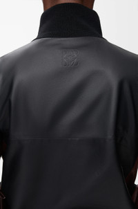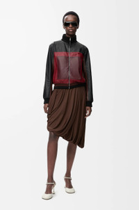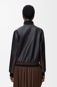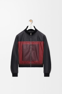 Jacket in lightweight nappa lambskin featuring placed intarsia squares inspired by Josef Albers's "Homage to the Square" series. This jacket is part of the LOEWE x Albers collection. - Small fit, short length - High neck - Rib knit collar, hem and cuffs - Zip front fastening with Puzzle puller - Seam pockets, inside welt pocket - Fully lined - Embossed Anagram placed at the back Colour: Black/Burgundy Main material: Nappa Weight: 0.4 kg Made in: Italy Materials & care Main Material: 100% lambskin