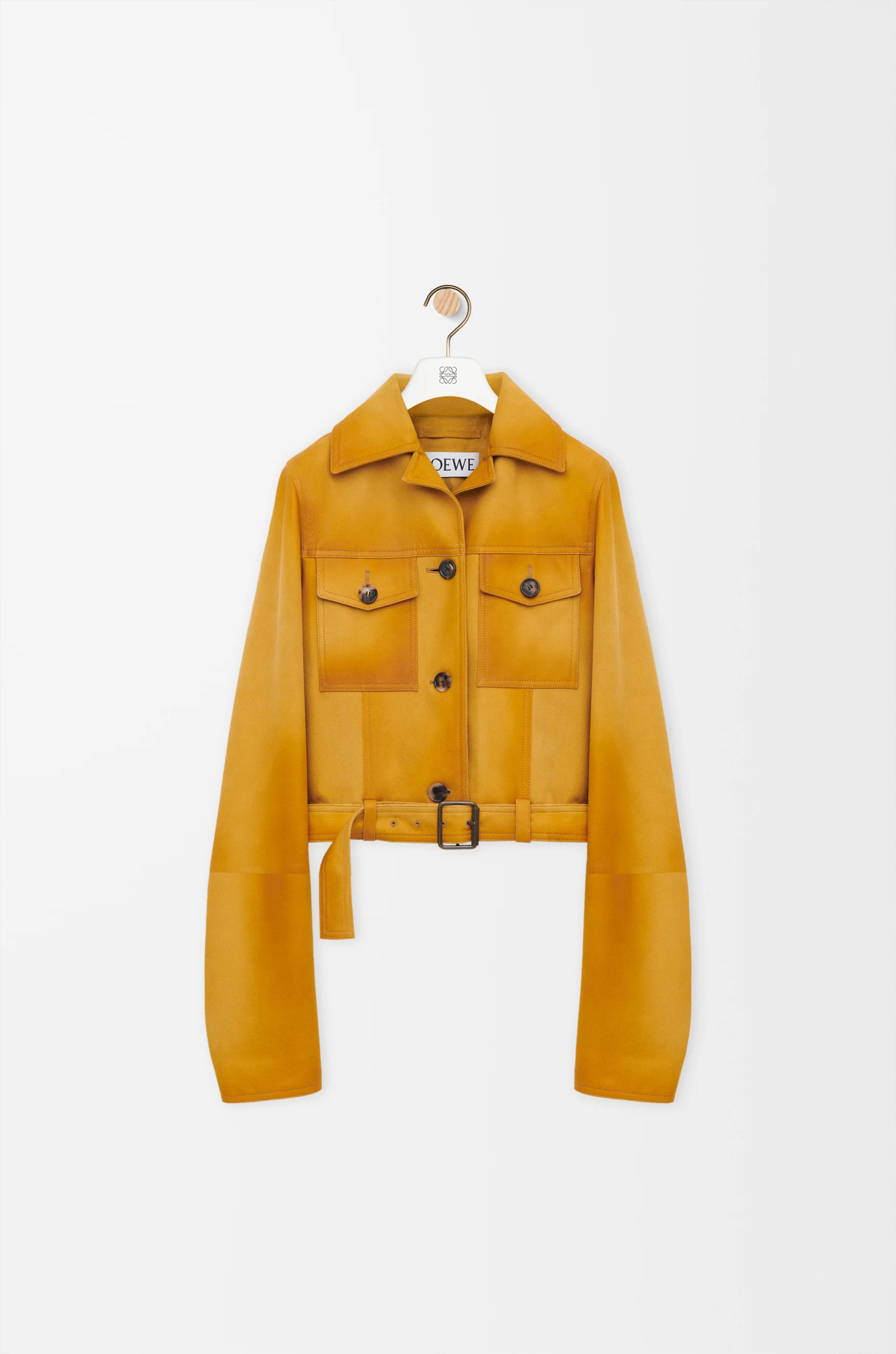 Jacket in lightweight suede lambskin featuring a hand-sprayed faded-effect treatment. - Regular fit, short length - Classic collar - Button front fastening - Buttoned chest patch pockets, inside welt pocket - Adjustable belt at the hem - Fully lined - LOEWE embossed leather patch placed at the back Colour: Light Tan Main material: Suede Weight: 0.97 kg Made in: Italy Materials & care Main Material: 100% lambskin