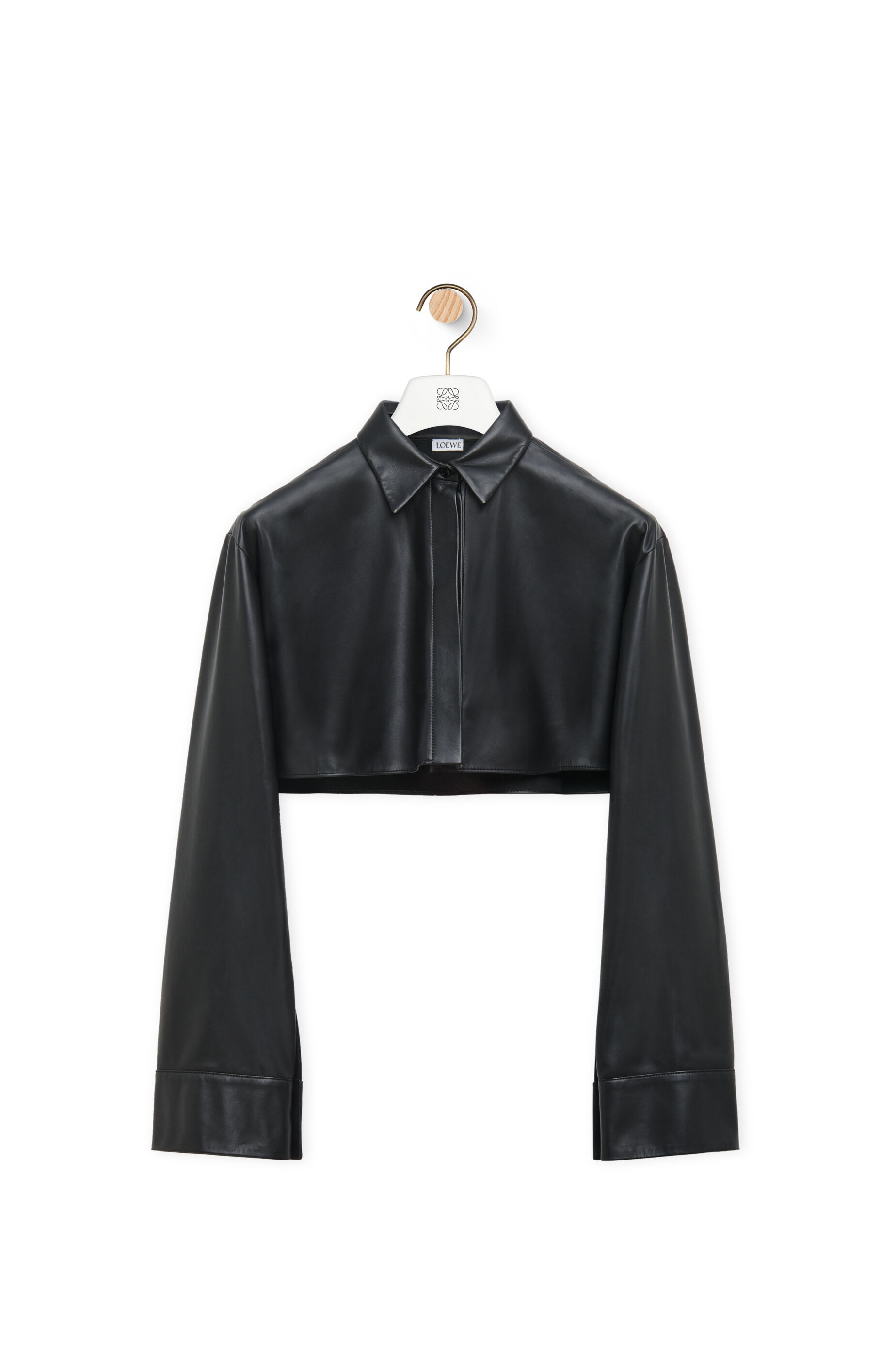 Shirt crafted in lightweight satin nappa lambskin with ultra soft glove touch. - Relaxed fit - Cropped length - Boxy silhouette - Classic collar - Long sleeves - Buttoned back to front cuffs - Concealed button front fastening Details - Colour: Black - Main material: Nappa - Weight: 0.4 kg - Model ID: S540Y30L45 - Made in: Spain
