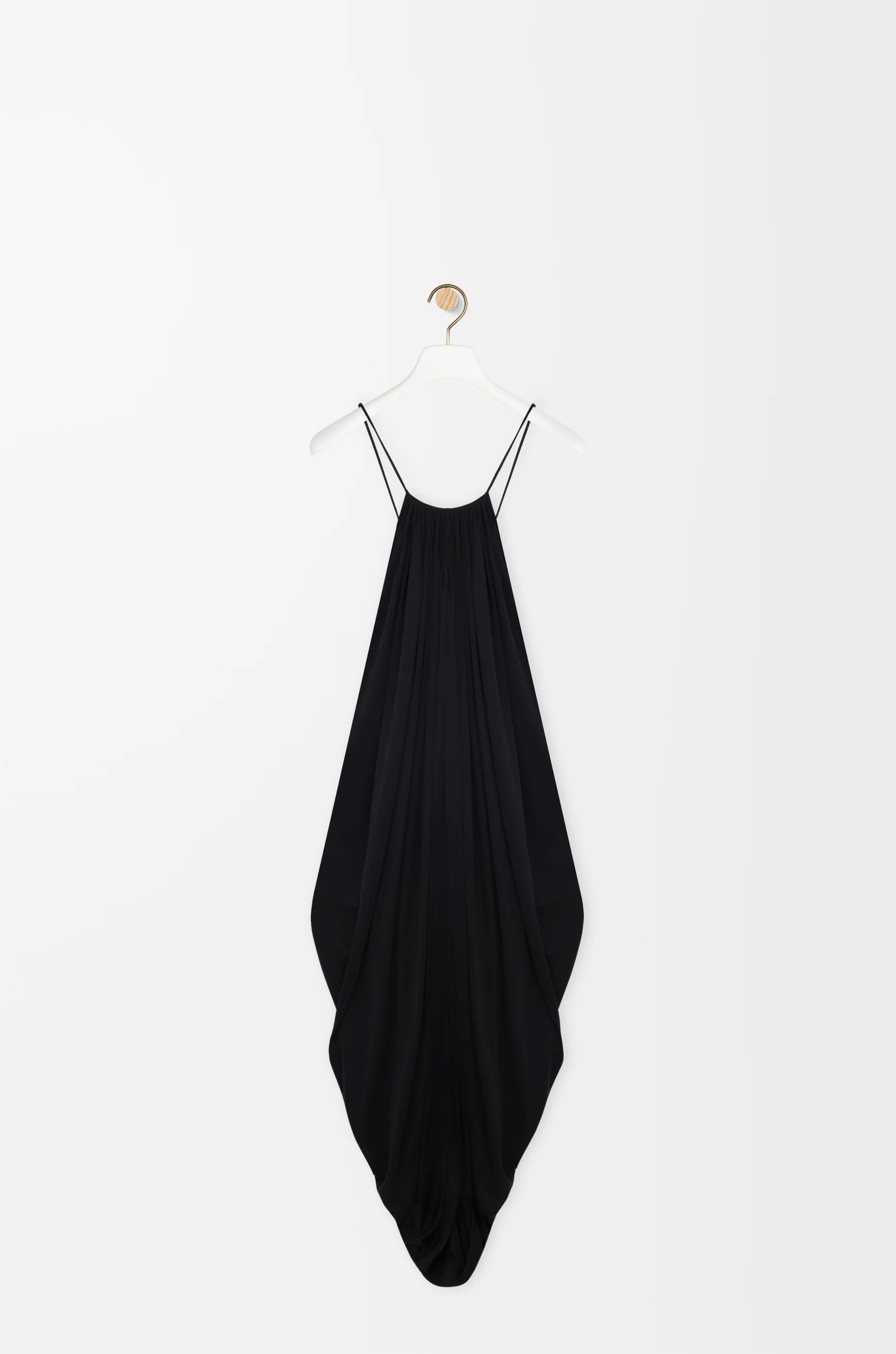 Dress in lightweight fluid silk jersey featuring an asymmetric draped silhouette and an open back with an oversized metal Anagram. - Regular fit, mid length - Halterneck - Thin straps Colour: Black Main material: Silk Weight: 0.6 kg Made in: Italy Materials & care Main Material: 100% silk
