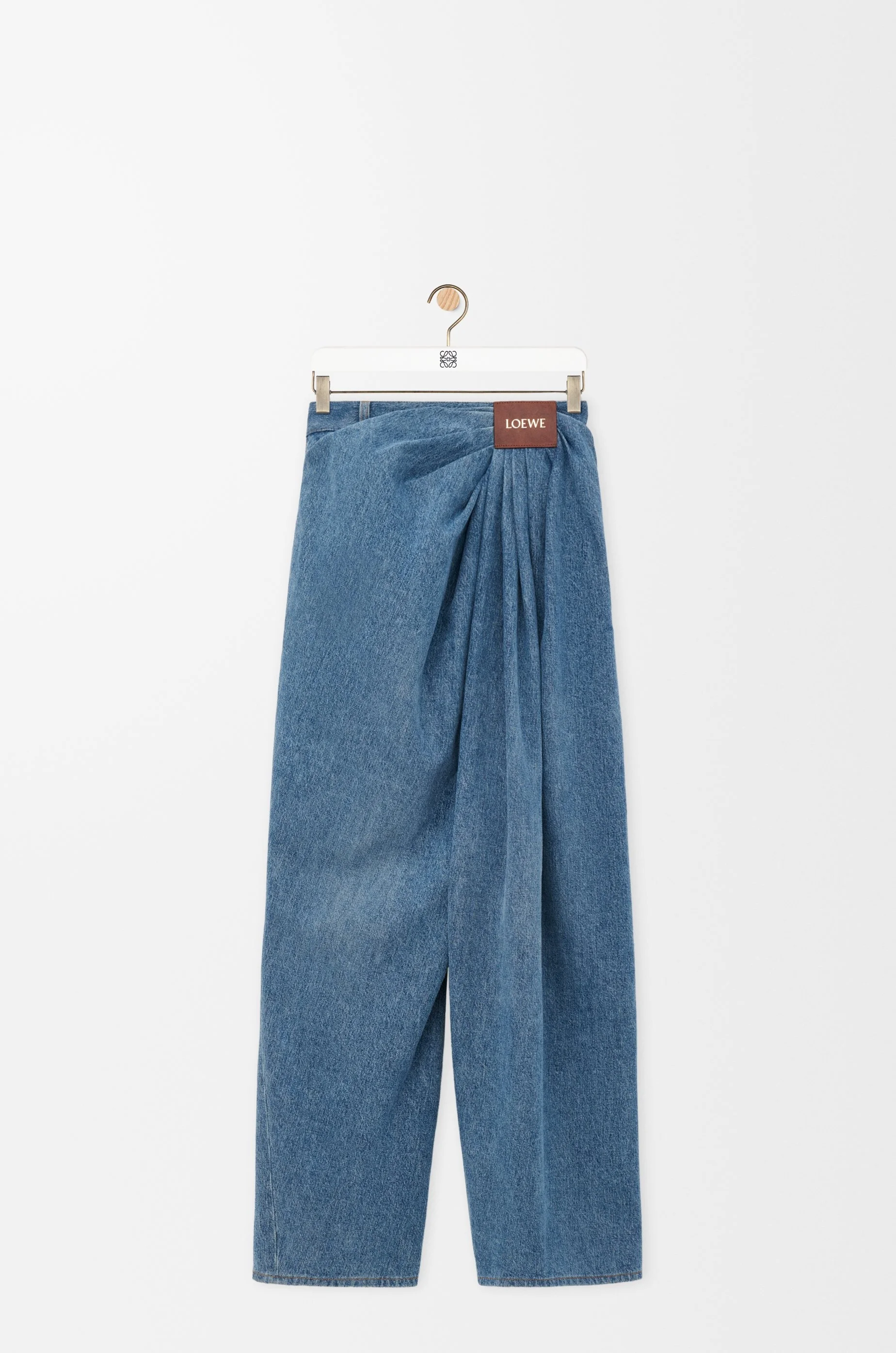 Jeans in medium-weight washed cotton denim featuring asymmetric hand-gathered draping at the front. - Relaxed fit, regular length - Mid waist, loose leg - Side hook and zip fastening - Side pockets, buttoned rear welt pocket - LOEWE embossed leather patch placed at the front Details - Colour : Indigo Blue - Main material : Cotton - Weight : 1.3 kg - Model ID : S540Y11X96 - Made in : Italy