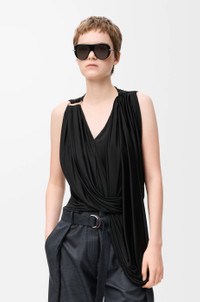Top in lightweight fluid viscose jersey featuring an asymmetric silhouette and a draped construction with a D-ring on the shoulder. - Regular fit, regular length - V-neck Colour: Black Main material: Viscose Weight: 0.29 kg Made in: Spain Materials & care Main Material: 100% viscose