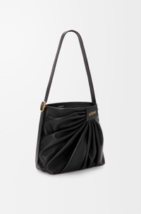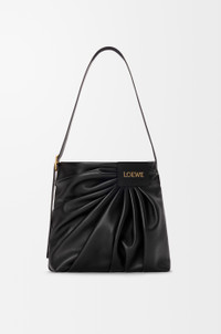 The Draped tote is a distinctive bag inspired by LOEWE's signature ready-to-wear draped silhouettes. Its soft scultpural shape is complemented by a wide strap adorned with a bold LOEWE-engraved buckle. This version is crafted in mellow nappa lambskin. - Shoulder or crossbody carry - Adjustable strap - Magnetic closure - One internal calfskin patch pocket - Herringbone cotton canvas lining - Gold embossed LOEWE Colour: Black Metallic colour: Gold Main material: Mellow nappa lambskin Strap length: 62 - 100 cm Strap drop: 27 - 46 cm Weight: 0.62 kg Height: 30 cm Width: 29 cm Depth: 13 cm Made in: Spain
