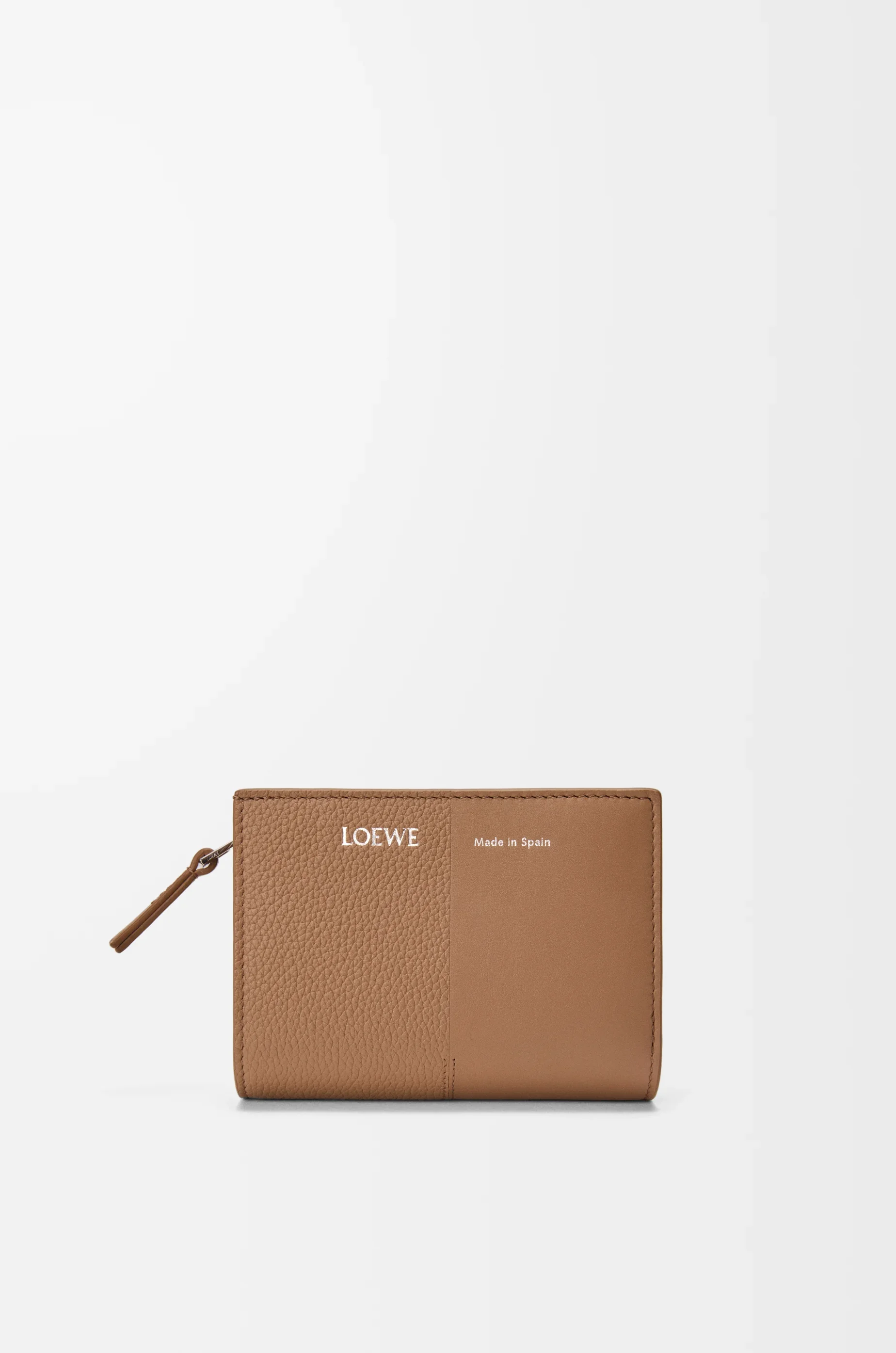 Compact wallet in smooth and grained calfskin crafted using the leather marquetry technique. - Six card slots, three internal slip pockets - One zipped coin compartment with calfskin pull - Snap button closure - Calfskin lining - Gold or silver embossed LOEWE Made in Spain Colour: Mocha Metallic colour: Palladium Main material: Smooth/grained calf Weight: 0.1 kg Height: 8.5 cm Width: 11.4 cm Depth: 3 cm Made in: Spain