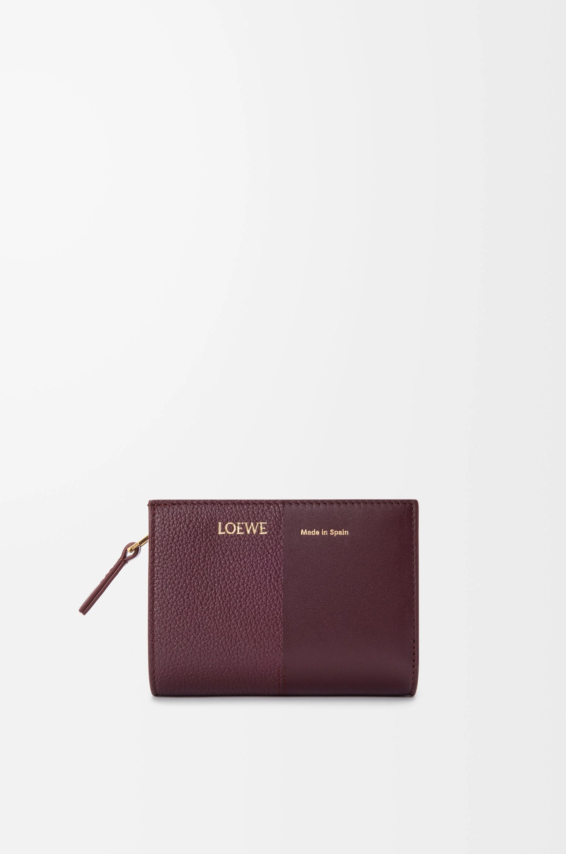 Compact wallet in smooth and grained calfskin crafted using the leather marquetry technique. - Six card slots, three internal slip pockets - One zipped coin compartment with calfskin pull - Snap button closure - Calfskin lining - Gold or silver embossed LOEWE Made in Spain Colour: Dark Burgundy Metallic colour: Gold Main material: Smooth/grained calf Weight: 0.1 kg Height: 8.5 cm Width: 11.4 cm Depth: 3 cm Made in: Spain