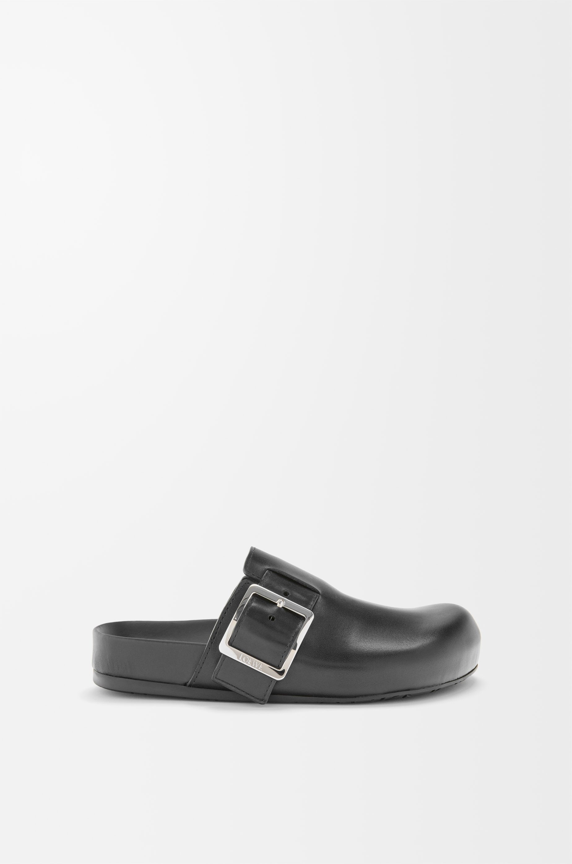 Mule in vegetable-tanned calfskin featuring the signature LOEWE square buckle. - 25mm heel - Embossed LOEWE on the buckle - Moulded ergonomic fussbett in leather - Embossed Anagram rubber outsole Details - Colour : Black - Main material : Vegetal Calf - Heel height : 2.5 - Weight : 0.9 kg - Model ID : LLSS465X03 - Made in : Italy