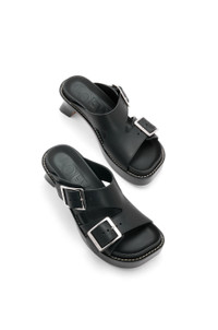 Heeled slide in vegetal calf, featuring two adjustable straps with oversized LOEWE buckles and an architectural slanted heel complemented by the "Ease" ergonomic fussbet. - 90mm heel - Branded metal buckle closure - Covered fussbet - Contrast stitching Details - Colour: Black - Main material: Vegetal Calf - Heel height: 7 - Weight: 1.24 kg - Model ID: L814465X83 - Made in: Italy