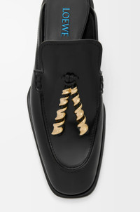 Loafer mule in brushed calfskin with tonal hand-dyed edging featuring a unique toe shape and gold-finish coil embellishments in a classic loafer construction. - 20mm heel - Rubber-injected leather sole Colour: Black Main material: Brushed calf Weight: 0.77 kg Made in: Italy