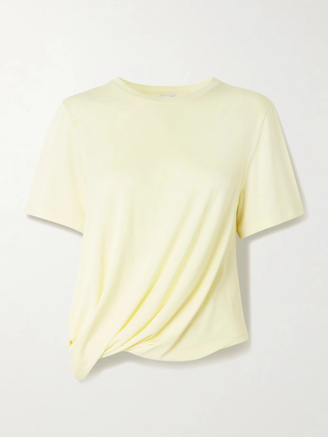 Loewe's T-shirt is embroidered with the label's signature 'Anagram'. It's draped from a crispy jersey in a summer-ready pastel-yellow and has an asymmetric hem.