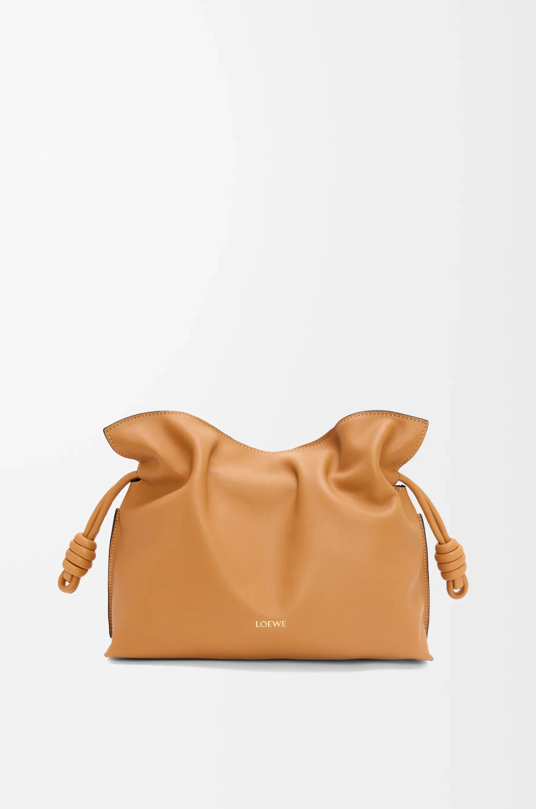 Launched in the 1980s, the Flamenco Clutch cinches closed using drawstring pulls finished in signature coiled knots. This version is crafted in nappa calfskin. - The Flamenco can hold for example a large wallet, all mobile phones or an A5 notebook, 0.5L. bottle and sunglasses case. - Shoulder, crossbody or hand carry - Detachable and adjustable strap - Discreet magnetic closure - Gold suede lining - Gold or silver LOEWE embossed Details - Colour: Warm Desert - Metallic colour: Gold - Main material: Nappa Calf - Strap length: 96 - 120 cm - Weight: 0.5 kg - Height (cm): 24.5 - Width (cm): 30 - Depth (cm): 10.5 - Height (inch): 9.6 - Width (inch): 11.8 - Depth (inch): 4.1 - Model ID: A411FC1XBF - CIL: 0010966042 - Made in: Spain