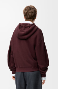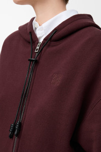 Hoodie in medium-weight cotton and cashmere fleece featuring a Flamenco-inspired leather knot drawstring. - Relaxed fit, regular length - Curved sleeves - Ribbed cuffs and hem - Zip front fastening Colour: Dark Burgundy Main material: Cotton/cashmere Weight: 0.84 kg Made in: Portugal Materials & care Main Material: 95% cotton 5% cashmere