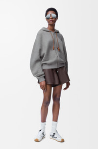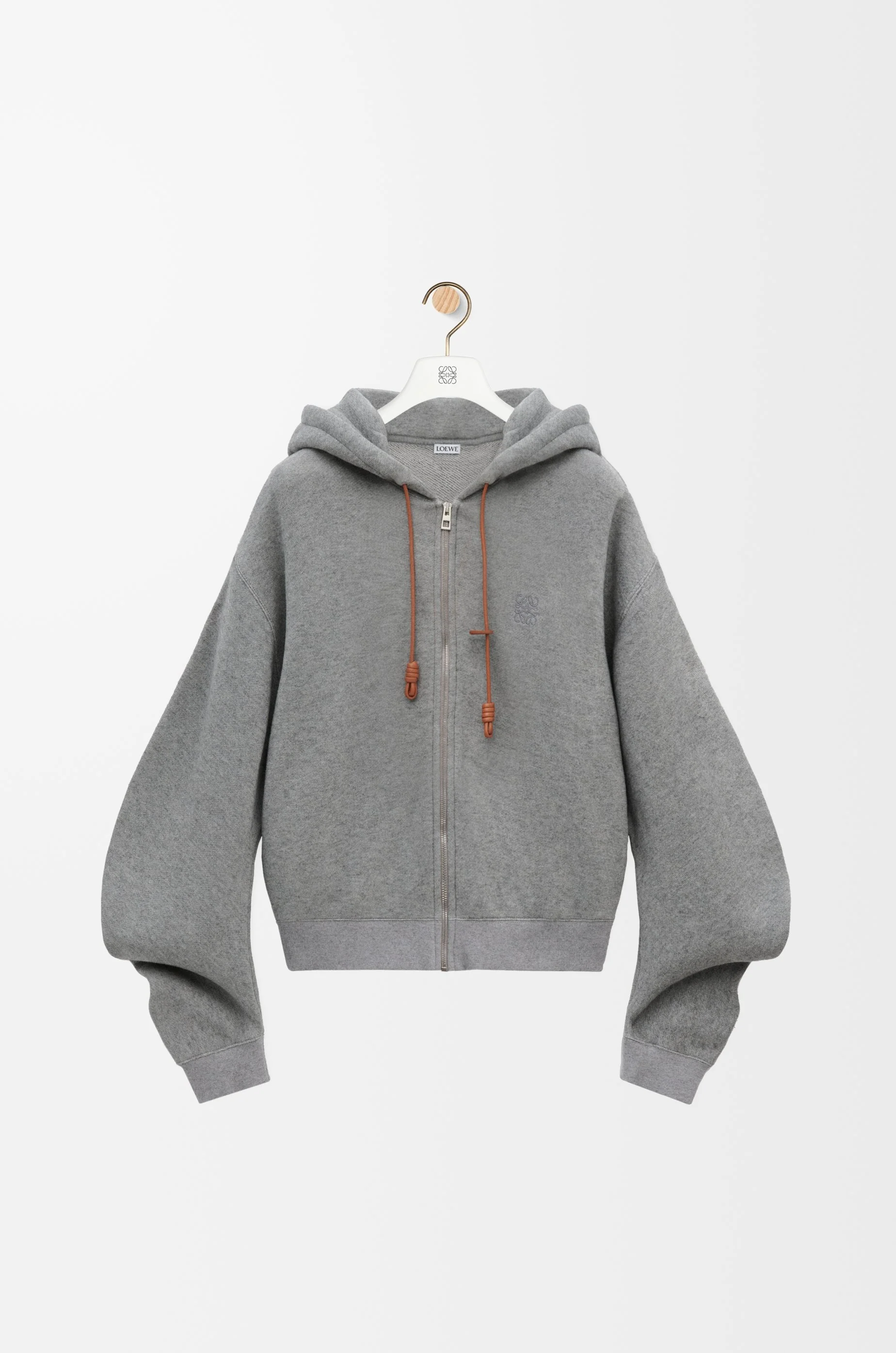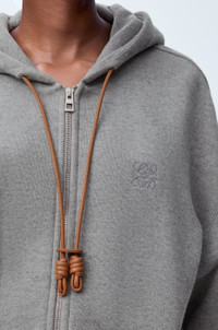 Hoodie in medium-weight cotton and cashmere fleece featuring a hooded collar with a Flamenco-inspired leather knot drawstring. - Relaxed fit, regular length - Curved sleeves - Ribbed cuffs and hem - Zip front fastening Colour: Grey Main material: Cotton/Cashemere Weight: 0.84 kg Made in: Portugal Materials & care Main Material: 95% cotton 5% cashmere