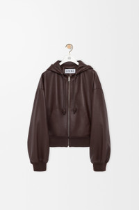 Hoodie in lightweight nappa lambskin featuring a hooded collar with a Flamenco-inspired drawstring. - Relaxed fit, regular length - Zip front fastening - Rib knit cuffs and hem - Kangaroo pockets - Fully lined - LOEWE Anagram embossed leather patch placed on the hood Colour: Chocolate Brown Main material: Nappa Weight: 1.0 kg Made in: Italy Materials & care Main Material: 100% lambskin