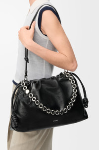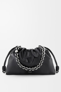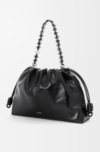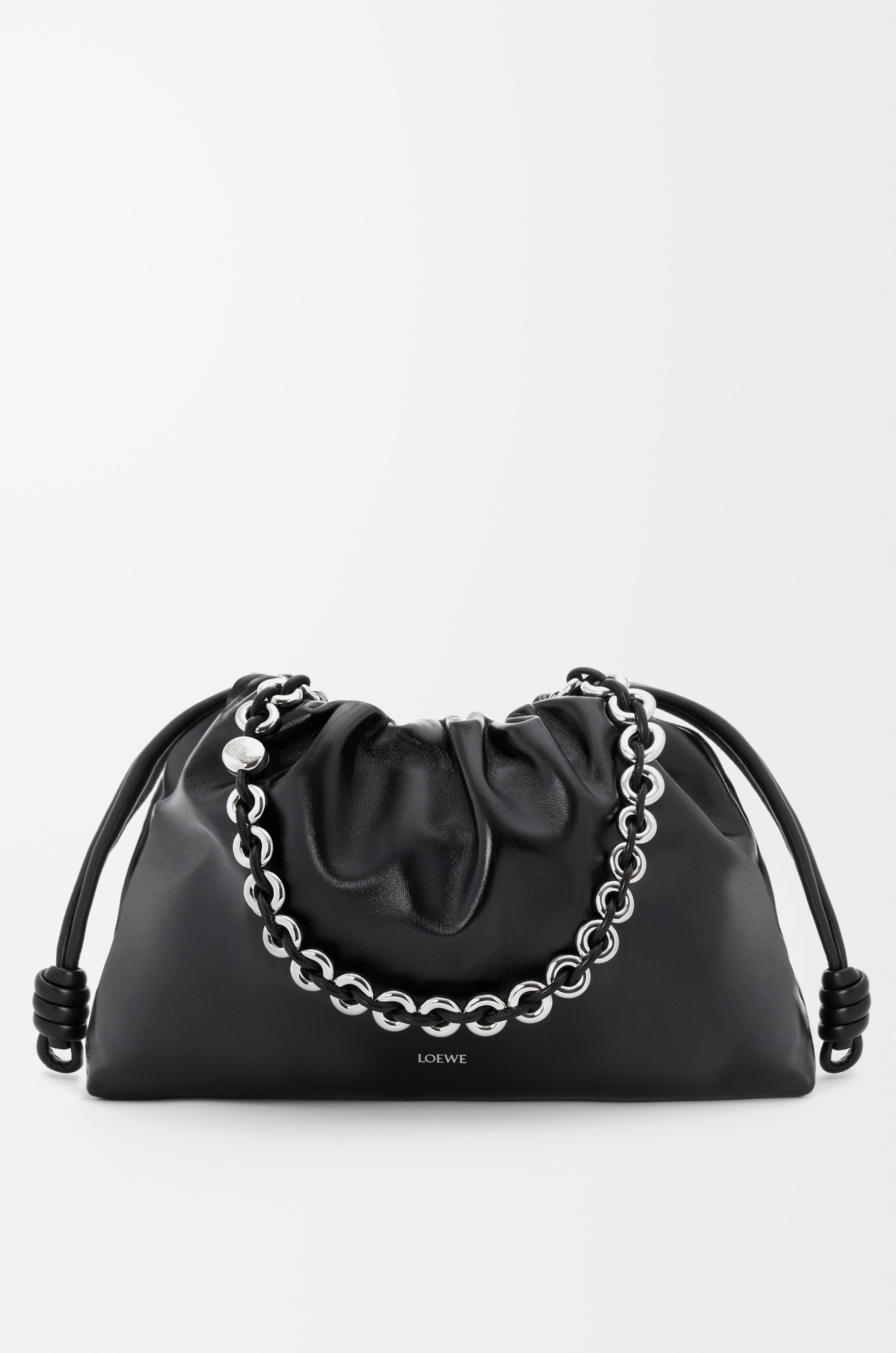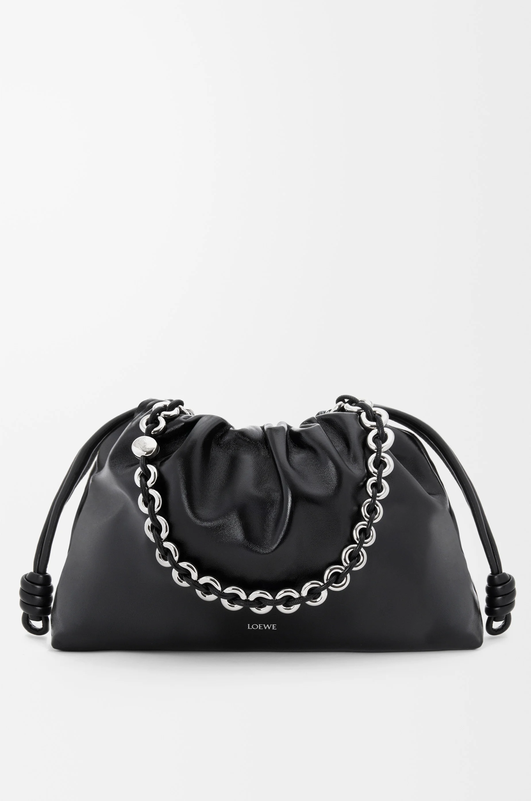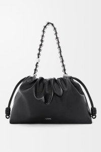 The Flamenco purse is a lightweight and soft bag with a ruched shape, historical knot drawstrings and a donut chain. This large version is crafted in patent nappa lambskin. - Shoulder, crossbody or hand carry - Detachable donut chain with Anagram Pebble - Detachable and adjustable leather strap - Magnetic closure - Suede lining - Silver embossed LOEWE Colour: Black Metallic colour: Palladium Main material: Patent Nappa Lambskin Strap length: 74/ 78 - 139 cm Strap drop: 33/ 40 - 72 cm Weight: 0.712 kg Height: 26 cm Width: 41 cm Depth: 9 cm Made in: Spain