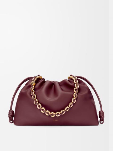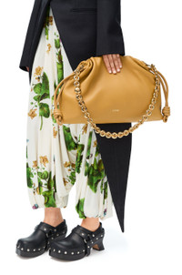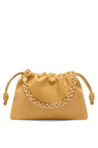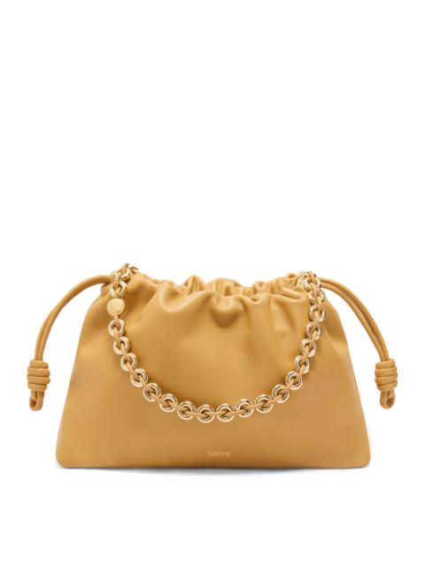 The Flamenco Purse is defined by a ruched design inspired by the Flamenco line's aesthetics, with key details such as the signature knots at the sides and the donut chain, reworked here with thicker proportions. This large version is crafted in mellow nappa lambskin. - Shoulder, crossbody or hand carry - Detachable and adjustable leather strap - Detachable donut chain adorned with an Anagram Pebble - Discreet magnetic closure - Suede lining - Gold or silver embossed LOEWE Details - Colour : Sahara - Metallic colour : Gold - Main material : Mellow Nappa Lambskin - Strap length : 74/ 78 - 139 cm - Strap drop : 33/ 40 - 72 cm - Handle drop : 33 cm - Weight : 0.65 kg - Height (cm) : 26 - Width (cm) : 41 - Depth (cm) : 9 - Height (inch) : 10.2 - Width (inch) : 16.1 - Depth (inch) : 3.5 - Model ID : A411FPDX01 - CIL : - 0011182227 - Made in : Spain