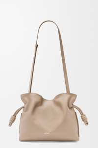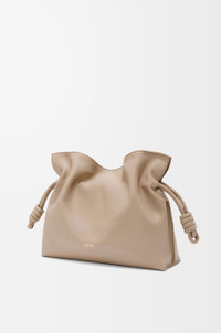 The Flamenco clutch is a soft and slouchy bag with a cinched closure and historical knot drawstrings. This medium version is crafted in nappa calfskin. - Shoulder, crossbody or hand carry - Detachable and adjustable strap - Magnetic closure - Suede lining - Gold or silver embossed LOEWE Colour: Sand Metallic colour: Gold Main material: Nappa calf Strap length: 96-120 cm Strap drop: 38 - 44 cm Weight: 0.5 kg Height: 24.5 cm Width: 30 cm Depth: 10.5 cm Made in: Spain