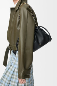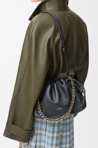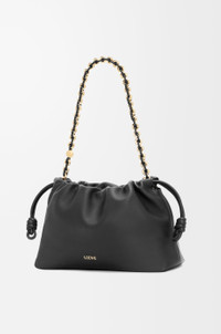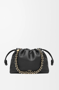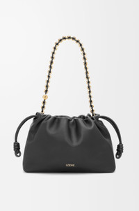 The sensual and mellow Flamenco Purse is defined by a ruched design complemented by key details such as the signature knots at the sides. Versatile and functional, it can be carried as a clutch, worn over the shoulder using the donut chain or crossbody with the accompanying leather strap. This version is crafted in mellow nappa lambskin. - Shoulder, crossbody or hand carry - Detachable and adjustable leather strap - Detachable donut chain adorned with Anagram engraved Pebble - Discreet magnetic closure - Suede lining - Gold or silver embossed LOEWE Details - Colour: Black - Metallic colour: Gold - Main material: Mellow Nappa Lambskin - Strap length: 96 - 120 cm - Weight: 0.31 kg - Height (cm): 20 - Width (cm): 30 - Depth (cm): 10.5 - Height (inch): 7.9 - Width (inch): 11.8 - Depth (inch): 4.1 - Model ID: A411FCRX02 - CIL: 0010981520 - Made in: Spain