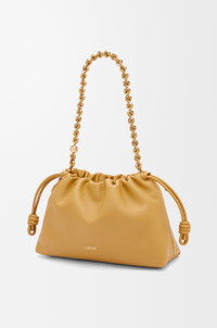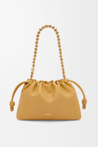 The sensual and mellow Flamenco Purse is defined by a ruched design complemented by key details such as the signature knots at the sides. Versatile and functional, it can be carried as a clutch, worn over the shoulder using the donut chain or crossbody with the accompanying leather strap. This version is crafted in mellow nappa lambskin. - Shoulder, crossbody or hand carry - Detachable and adjustable leather strap - Detachable donut chain adorned with Anagram engraved Pebble - Discreet magnetic closure - Suede lining - Gold or silver embossed LOEWE Details - Colour: Sahara - Metallic colour: Gold - Main material: Mellow Nappa Lambskin - Strap length: 96 - 120 cm - Weight: 0.31 kg - Height (cm): 20 - Width (cm): 30 - Depth (cm): 10.5 - Height (inch): 7.9 - Width (inch): 11.8 - Depth (inch): 4.1 - Model ID: A411FCRX02 - CIL: 0011036787 - Made in: Spain