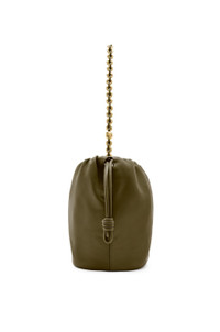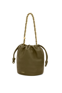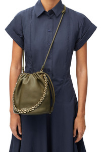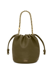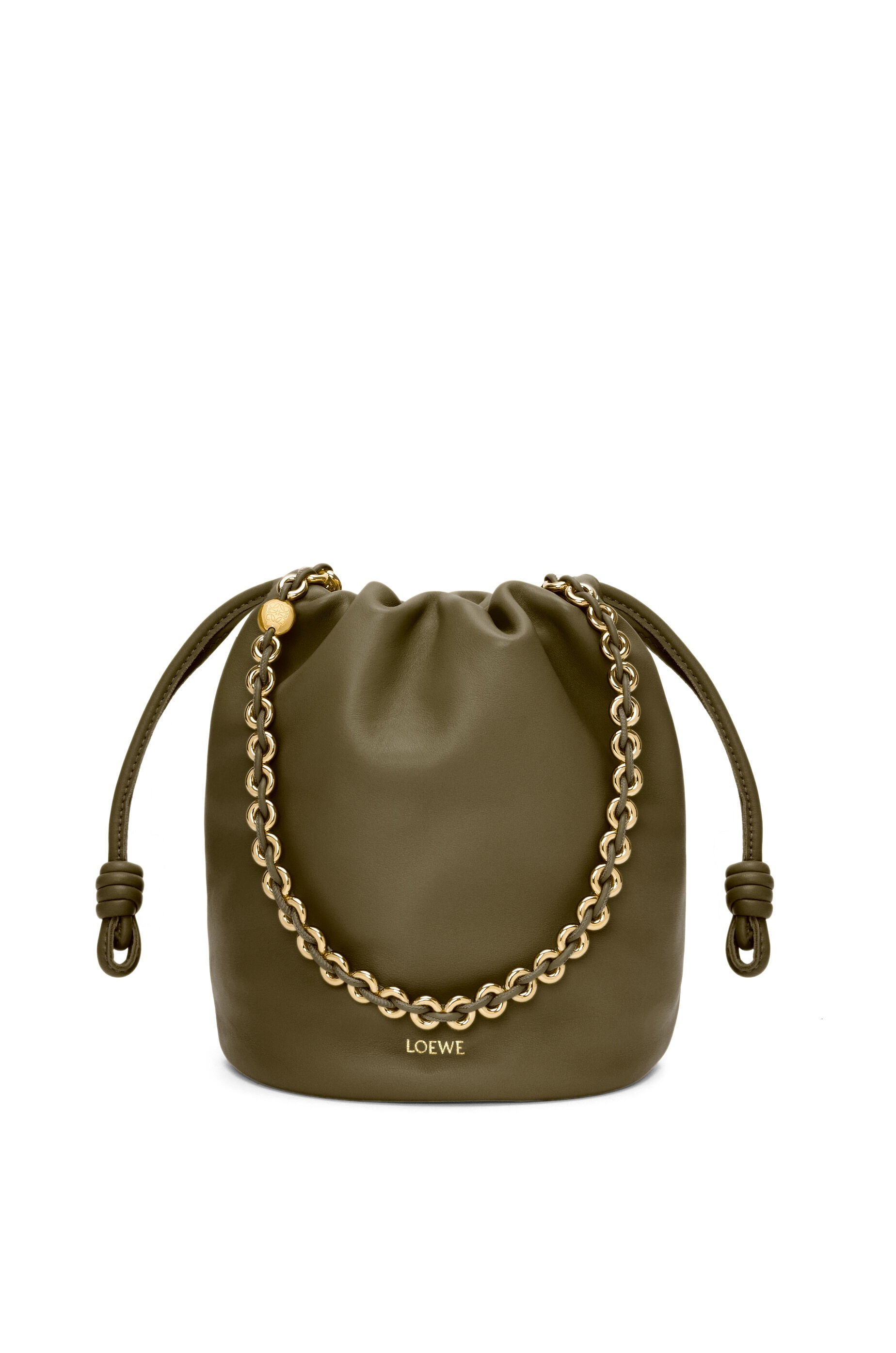 The sensual and mellow Flamenco Purse is defined by a ruched design complemented by key details such as the signature knots at the sides. The Bucket variation boasts a new everyday size while retaining the line's feminine aesthetics. Versatile and functional, it can be worn over the shoulder using the donut chain or crossbody with the accompanying leather strap. This version is crafted in mellow nappa lambskin. - Shoulder, crossbody or hand carry - Detachable and adjustable leather strap - Detachable donut chain adorned with Anagram engraved Pebble - Discreet magnetic closure - Suede lining - Gold or silver embossed LOEWE Details - Colour: Dark Khaki Green - Metallic colour: Gold - Main material: Mellow Nappa Lambskin - Strap length: 59 / 78 -138 cm - Weight: 0.52 kg - Height (cm): 24 - Width (cm): 32 - Depth (cm): 17 - Height (inch): 9.4 - Width (inch): 12.6 - Depth (inch): 6.7 - Model ID: A411FPBX02 - CIL: 0011091584 - Made in: Spain
