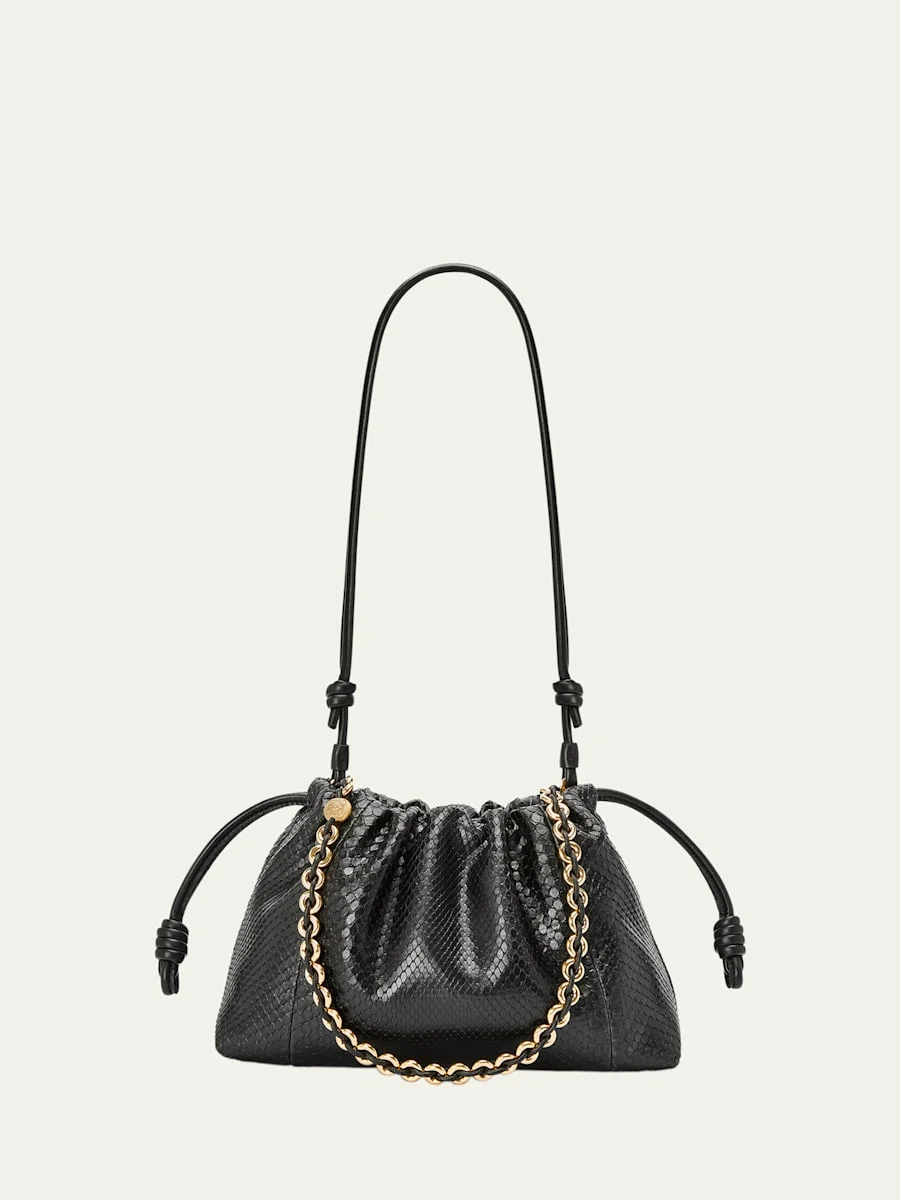 Loewe "Flamenco" shoulder bag in python leather Woven chain top handle Shoulder strap Drawstring closure Approx. 16.5"H x 24"W x 4.1"D Made in Spain This item cannot be sold or shipped to California. Online Inquiries: BGS21_V6CDQ| Store Inquiries: #4885589