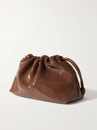 EDITORS'NOTES Loewe's updates the 'Flamenco' clutch with a chunky gold chain strap that drapes like jewelry when not in use - it's detachable, too. Crafted by artisans in Spain from leather, it's beautifully sequined and gathers along the drawstring top. There's enough space for your phone, wallet, keys and a few cosmetics inside. SIZE & FIT This item’s measurements are: - Min. Strap Length: 59cm / 23.2in - Depth: 12cm / 4.7in - Max. Strap Length: 73cm / 28.7in - Height: 20cm / 7.9in - Width: 29cm / 11.4in DETAILS & CARE - Chocolate leather (Calf and Lamb) - Detachable chain strap - Suede lining - Magnetic fastening at drawstring top - Comes with dust bag