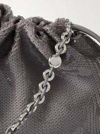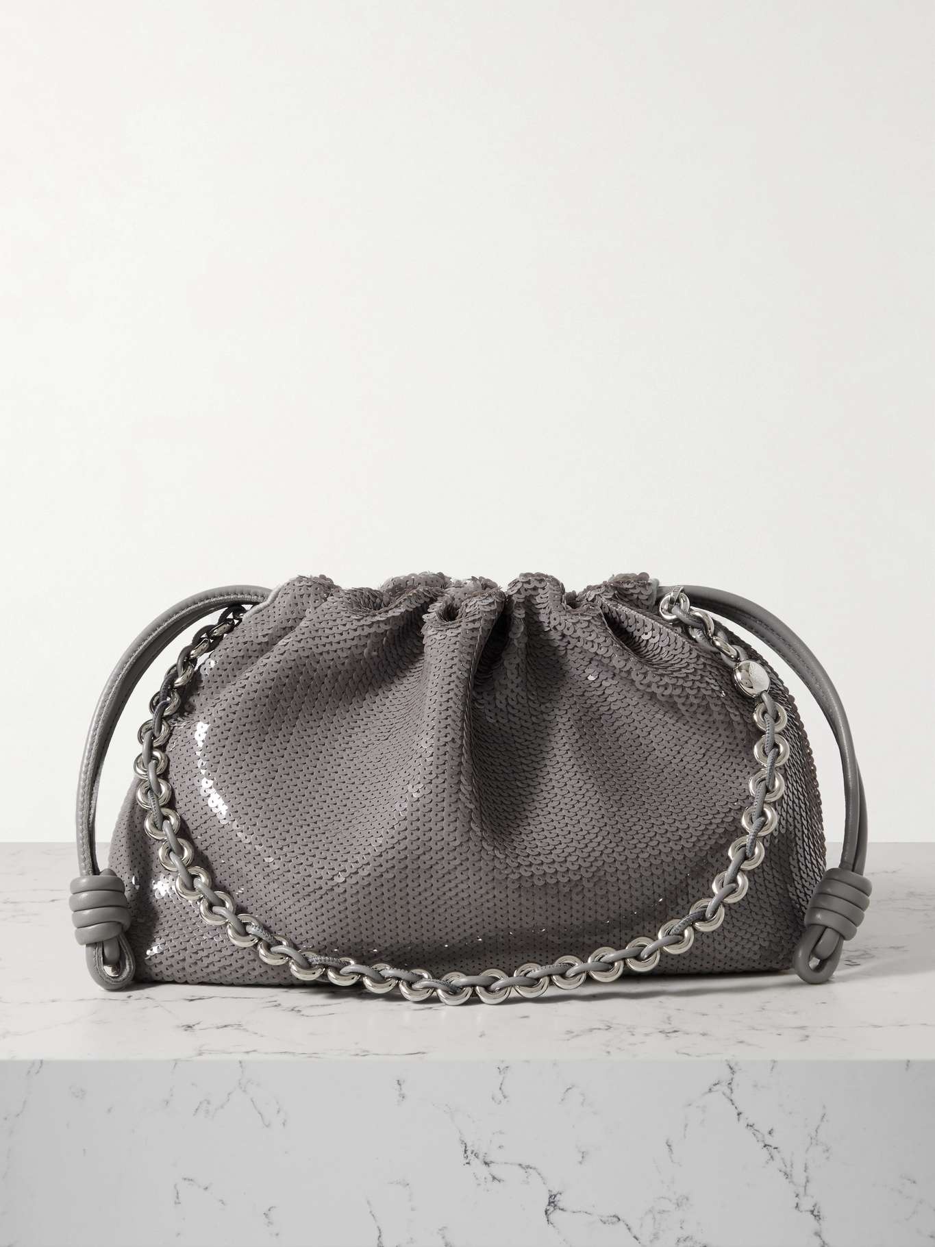 EDITORS'NOTES Loewe updates the 'Flamenco' clutch with a chunky silver chain strap that drapes like jewelry when not in use - it's detachable, too. Crafted in Spain from leather, it's beautifully sequined and gathers along the drawstring top. There's enough space for your phone, wallet, keys and a few cosmetics inside. SIZE & FIT This item’s measurements are: - Min. Strap Length: 59cm / 23.2in - Depth: 12cm / 4.7in - Max. Strap Length: 73cm / 28.7in - Height: 20cm / 7.9in - Width: 29cm / 11.4in DETAILS & CARE - Gray leather (Calf and Lamb) - Detachable chain strap - Suede lining - Magnetic fastening at drawstring top - Comes with dust bag