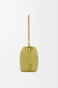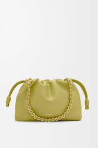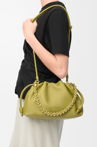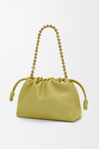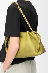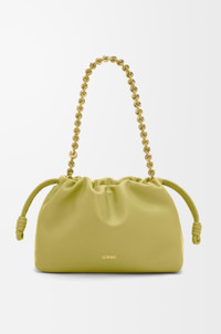 The Flamenco purse is a lightweight and soft bag with a ruched shape, historical knot drawstrings and a donut chain. This medium version is crafted in mellow nappa lambskin. - Shoulder, crossbody or hand carry - Detachable donut chain with Anagram Pebble - Detachable and adjustable leather strap - Magnetic closure - Suede lining - Gold or silver embossed LOEWE Colour: Light Moss Metallic colour: Gold Main material: Mellow Nappa Lambskin Strap length: 59 / 82 - 142 cm Strap drop: 27 / 37 - 67 cm Weight: 0.31 kg Height: 20 cm Width: 30 cm Depth: 10.5 cm Made in: Spain